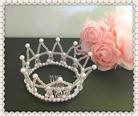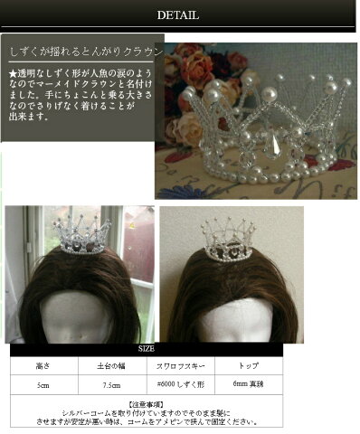 商品説明詳細説明(レターパックで発送) しずくが揺れるマーメイドクラウンサイズ直径6cm×高さ3.5cm 材料 ・SW(#6000/しずく形)クリスタル15mm1個 ・SW(#5328/そろばん形)5mm2個 ・カットガラス8mm11個 ・真珠6mm11個 ・真珠5mm77個 ・丸小ビーズ ・ワイヤー(#20)(#26)注意 ・商品ごとに、大きさなどに多少差がある場合がございます。