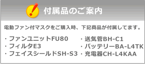 フィルター E3 ファンユニット FU80 バッテリー BA-L4K 充電器 CH-L4KAA 送気管 BH-C1 フェイスシールド用 送気管カバー #03553 フィルターセットW80 電電ファン付呼吸用保護具(以下PARP)は、事業場その他で空気中に浮遊する粒子状物質(粉じん・ヒューム・ミスト等)を、吸入する恐れがあるときに使用するろ過式の呼吸用保護具です。