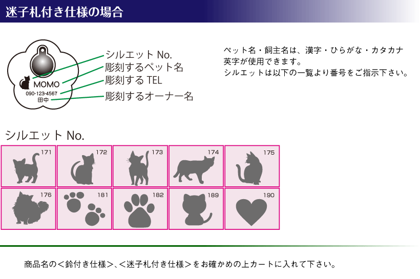 シルエットの一覧は、こちら*『鈴付属』の<鈴付き仕様>と『鈴付き迷子札付属』の<迷子札付き仕様>をお間違いのないよう商品名内の<仕様>をご確認いただきカートに入れて下さい。
