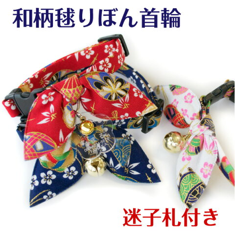 猫 首輪 和柄毬りぼん< 梅型 迷子札 付き > セーフティーバックル 鈴 ネームタグ ねこ 震災 災害 など万が一のためにも