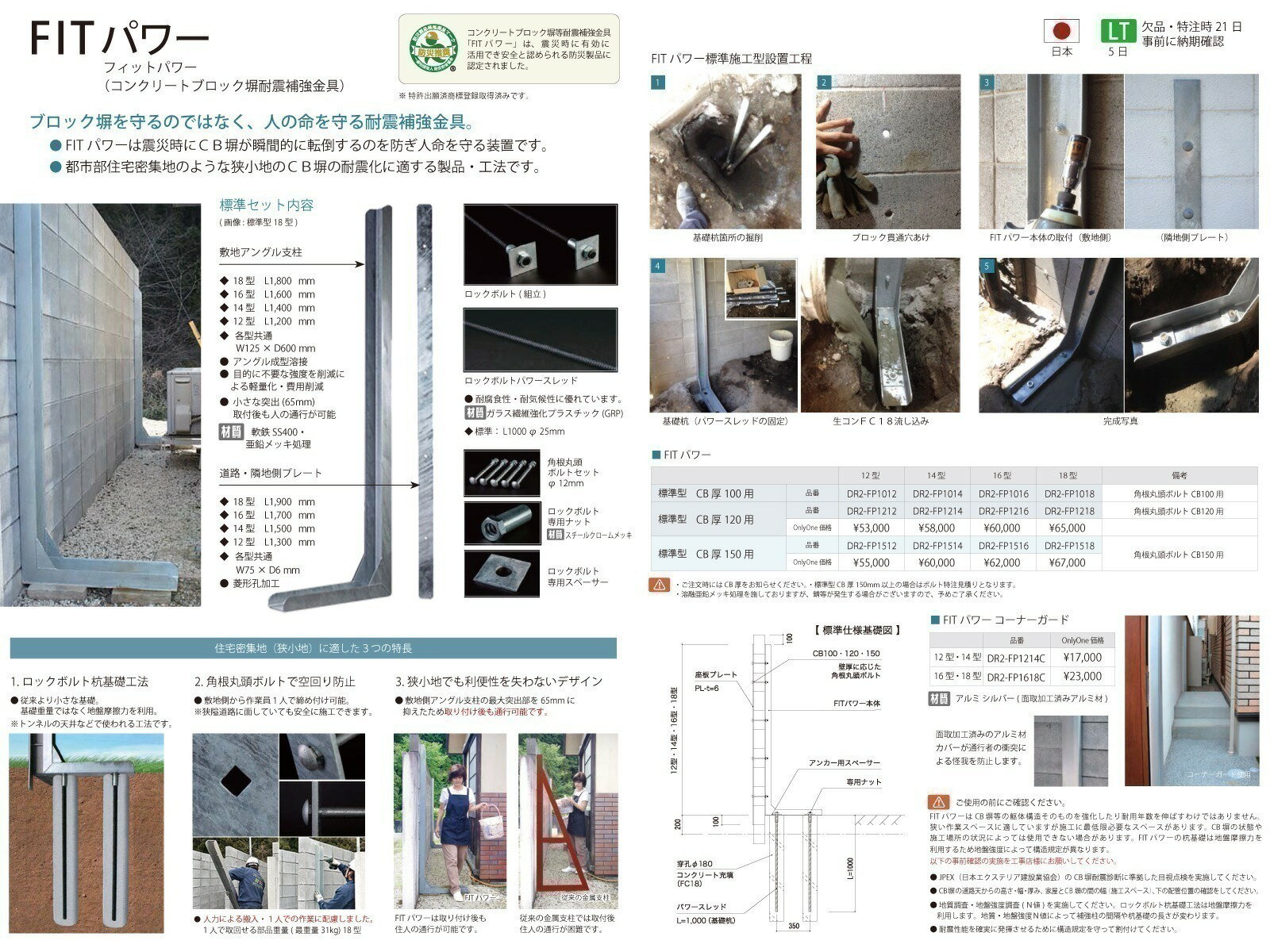 当店人気ランキングはこちらから ●関連商品 オンリーワンクラブFITパワー 標準12型 CB厚100用 フィットパワー (コンクリートブロック塀耐震補強金具)52,800円オンリーワンクラブFITパワー 標準14型 CB厚100用 フィットパワー (コンクリートブロック塀耐震補強金具)57,200円オンリーワンクラブFITパワー 標準16型 CB厚100用 フィットパワー (コンクリートブロック塀耐震補強金具)58,960円オンリーワンクラブFITパワー 標準18型 CB厚100用 フィットパワー (コンクリートブロック塀耐震補強金具)63,360円オンリーワンクラブFITパワー コーナーガード 12・14型用 フィットパワー用オプション14,960円 オンリーワンクラブFITパワー 標準12型 CB厚120用 フィットパワー (コンクリートブロック塀耐震補強金具)52,800円オンリーワンクラブFITパワー 標準14型 CB厚120用 フィットパワー (コンクリートブロック塀耐震補強金具)57,200円オンリーワンクラブFITパワー 標準16型 CB厚120用 フィットパワー (コンクリートブロック塀耐震補強金具)58,960円オンリーワンクラブFITパワー 標準18型 CB厚120用 フィットパワー (コンクリートブロック塀耐震補強金具)63,360円オンリーワンクラブFITパワー コーナーガード 16・18型用 フィットパワー用オプション20,240円 オンリーワンクラブFITパワー 標準12型 CB厚150用 フィットパワー (コンクリートブロック塀耐震補強金具)54,560円オンリーワンクラブFITパワー 標準14型 CB厚150用 フィットパワー (コンクリートブロック塀耐震補強金具)58,960円オンリーワンクラブFITパワー 標準16型 CB厚150用 フィットパワー (コンクリートブロック塀耐震補強金具)60,720円オンリーワンクラブFITパワー 標準18型 CB厚150用 フィットパワー (コンクリートブロック塀耐震補強金具)65,120円