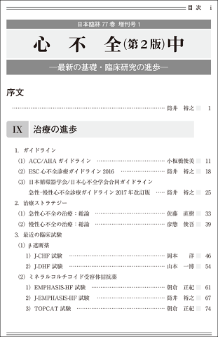 [心不全(第2版)]シリーズ ・心不全(上):総論 / 疫学 / 心不全の基礎研究…ほか ・心不全(中):治療の進歩 / 薬物治療概論…ほか ・心不全(下):看護・管理・支援 / 心不全の併存症…ほか [増刊・別冊]2019年 ・1月発行(別冊3):内分泌症候群(第3版)III ・2月発行(増刊1):心不全(第2版)中 ・3月発行(別冊4):内分泌症候群(第3版)IV ・5月発行(増刊2):心不全(第2版)下 ・6月発行(増刊3):医薬品副作用学(第3版)上 ・7月発行(増刊4):医薬品副作用学(第3版)下 ・9月発行(別冊5):循環器症候群(第3版)I ・10月発行(別冊6):循環器症候群(第3版)II ・11月発行(別冊7):循環器症候群(第3版)III ・12月発行(別冊9):消化管症候群(第3版)I ※「別冊 No.8 循環器症候群(第3版)IV」の発行は、2020年春頃を予定しております [増刊・別冊]2018年 ・1月発行(増刊1):実施診療のための最新認知症学 ・3月発行(増刊2):実婦人科がん ・4月発行(増刊3):炎症性腸疾患 ・5月発行(増刊4):パーキンソン病(第2版) ・6月発行(増刊5):老年医学(上) ・7月発行(増刊6):血管炎(第2版) ・8月発行(増刊7):老年医学(下) ・9月発行(別冊1):内分泌症候群(第3版)I ・10月発行(増刊8):食道癌(第2版) ・11月発行(別冊2):内分泌症候群(第3版)II ・12月発行(増刊9):心不全(第2版)上 日本臨牀 77巻増刊号1(通巻1158号) 心不全(第2版)中 −最新の基礎・臨床研究の進歩− ◇序 文 IX.治療の進歩 1.ガイドライン 2.治療ストラテジー 3.最近の臨床試験 X.薬物治療概論 1.心不全治療薬の使い方:総論 2.ACE 阻害薬 3.ARB(アンジオテンシン受容体拮抗薬) 4.β 遮断薬 5.ミネラルコルチコイド受容体拮抗薬 6.利尿薬 7.バソプレシン V2 受容体拮抗薬 8.ジギタリス製剤 9.カテコールアミン製剤 10.PDE III 阻害薬 11.Ca2+ 感受性増強薬 12.心房性ナトリウム利尿ペプチド XI.研究・開発中の薬物治療 1.慢性心不全に対するベリシグアトの治療効果 2.Omecamtiv mecarbil 3.SGLT2 阻害薬:エンパグリフロジン,カナグリフロジン, ダパグリフロジンなど XII.デバイス治療 1.心臓再同期療法(CRT/CRT-D) 2.ICD 3.心不全のモニタリングデバイス XIII.補助循環・外科療法 1.心不全の外科療法:総論 2.大動脈内バルーン・経皮的心肺補助法(PCPS) パンピング(IABP) 3.補助人工心臓(VAD) 4.左室形成術・僧帽弁関連手術 5.心臓移植の適応 6.心臓移植(小児) 7.心臓移植(成人)の実際 8.移植後の内科管理 9.僧帽弁形成術 10.大動脈弁閉鎖不全症に対する大動脈弁形成術 XIV.血液浄化療法 1.体外限外濾過法(ECUM)を用いた急性血液浄化療法 2.心不全における持続的静脈静脈血液濾過法(CVVH) 3.持続的血液濾過透析(CHDF) XV.輸液療法 1.心不全患者への輸液療法—高齢者,合併症など— XVI.非薬物療法 1.運動療法 2.心不全における呼吸補助療法 3.緩和ケア 4.栄養療法 XVII.心不全の予後 1.予後 2.心不全の予後予測因子とは XVIII.心不全の危険因子・予防 1.危険因子 2.心不全の予防 3.心不全を誘発・増悪させる薬剤