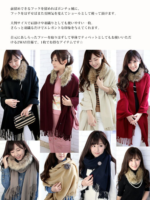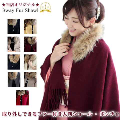 【クーポン配布中】ファー 襟 付き ストール ショール 大判 厚手 レディース 冬 用 フェイクファー ファー襟 取り外し 可能 無地 全9色 a3 防寒 着物 羽織 成人式 振袖 プレゼント ギフト 母の日