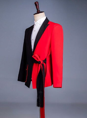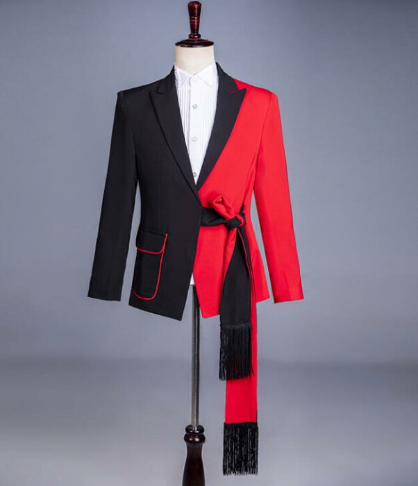 スーツ ステージ衣装 メンズ バイカラー 黒赤 スーツ セットアップ フリンジベルト 帯 おしゃれ 紳士服 礼服 ダンス衣装 舞台衣装 配色 ツートンカラースーツ 忘年会 パーティー 結婚式 格好良い 大人 演出 ダンス 衣装 舞台スーツ 派手 M L XL 2XL 3XL