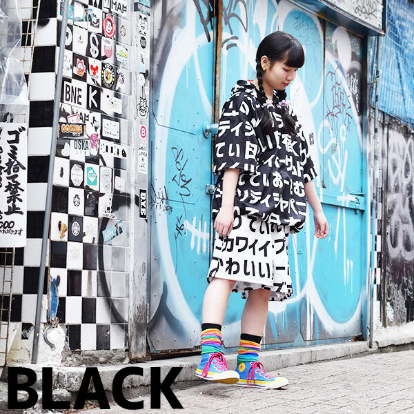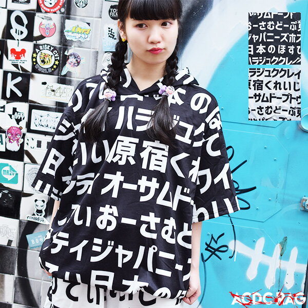 [半袖]ハラジュクBIGパーカー | 和柄 原宿 原宿系 ファッション レディース メンズ パーカー 漢字 カタカナ ひらがな 日本語 セットアップ 病みかわいい パンク ロック 半袖 薄手 夏 かわいい 派手カワ 個性的 ダンス衣装 ヒップホップ ACDC RAG